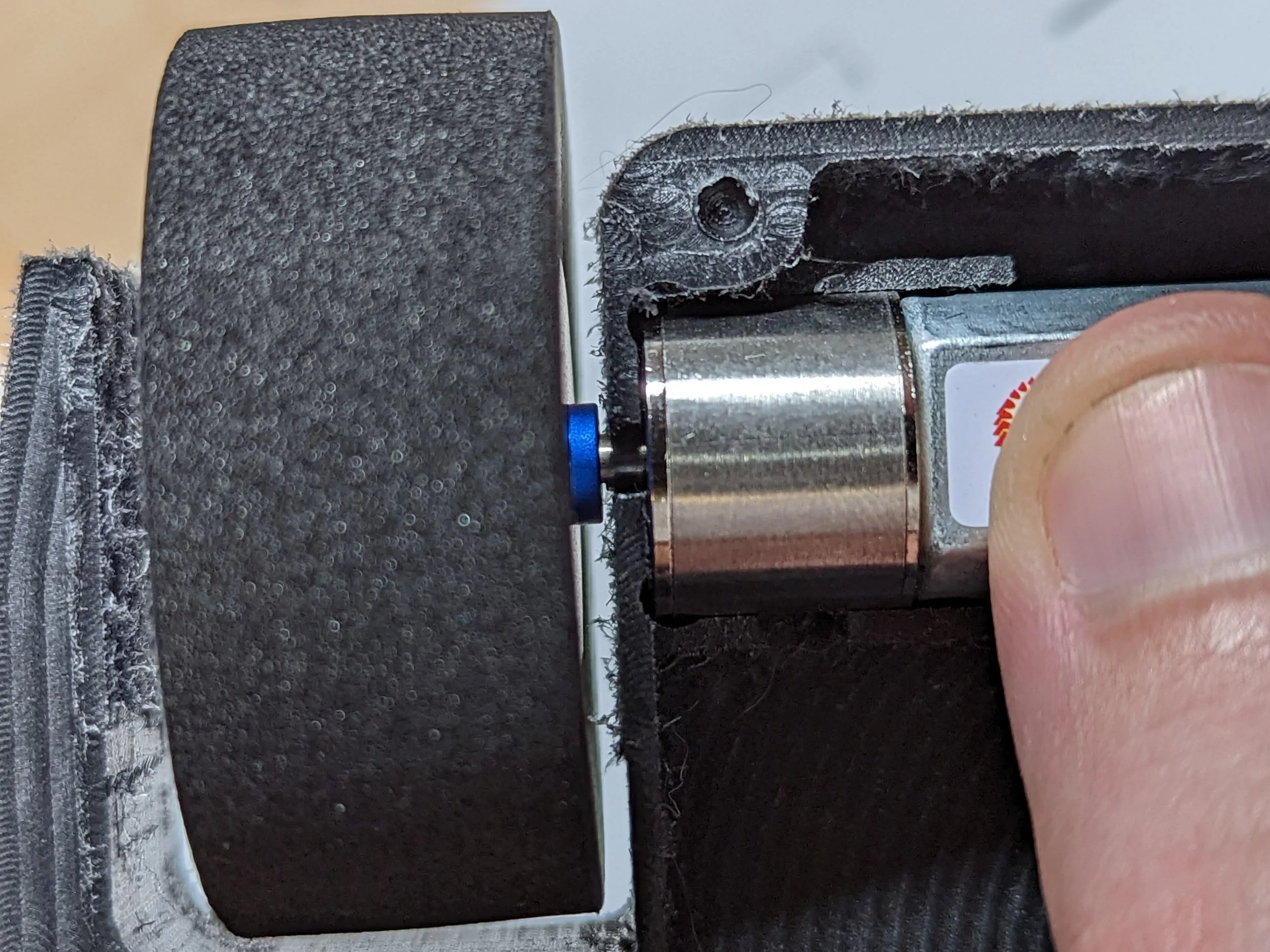 Now place a second thrust washer onto the shaft, sharp lip up against the UHMW side frame you are about to put on.